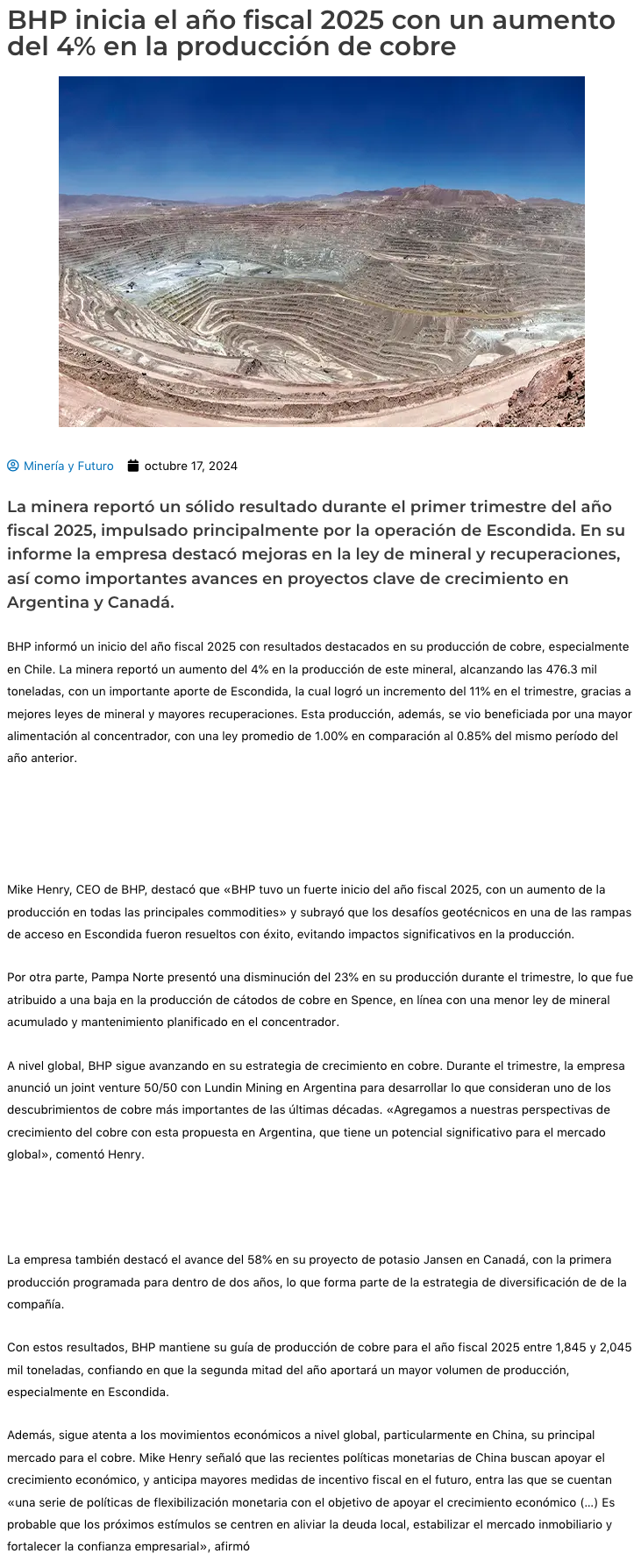 BHP reporta alza de 4% en producción de cobre en su primer trimestre fiscal: Escondida registró un aumento de 11% - (redimin)