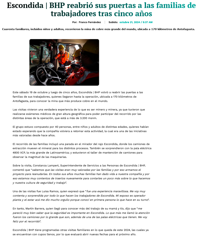 BHP reanuda visitas familiares en mina Escondida - (antofagasta.cl)