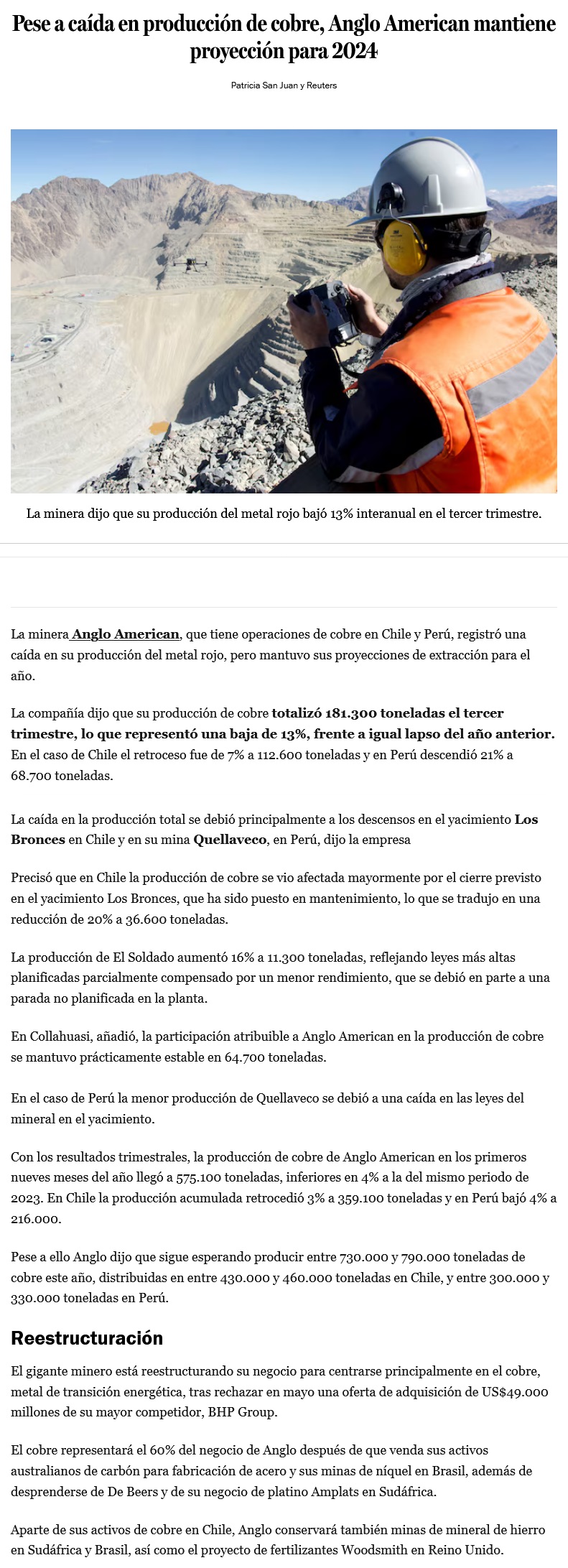 Pese a caída en producción de cobre, Anglo American mantiene proyección para 2024 - (tendenciashoy.cl)