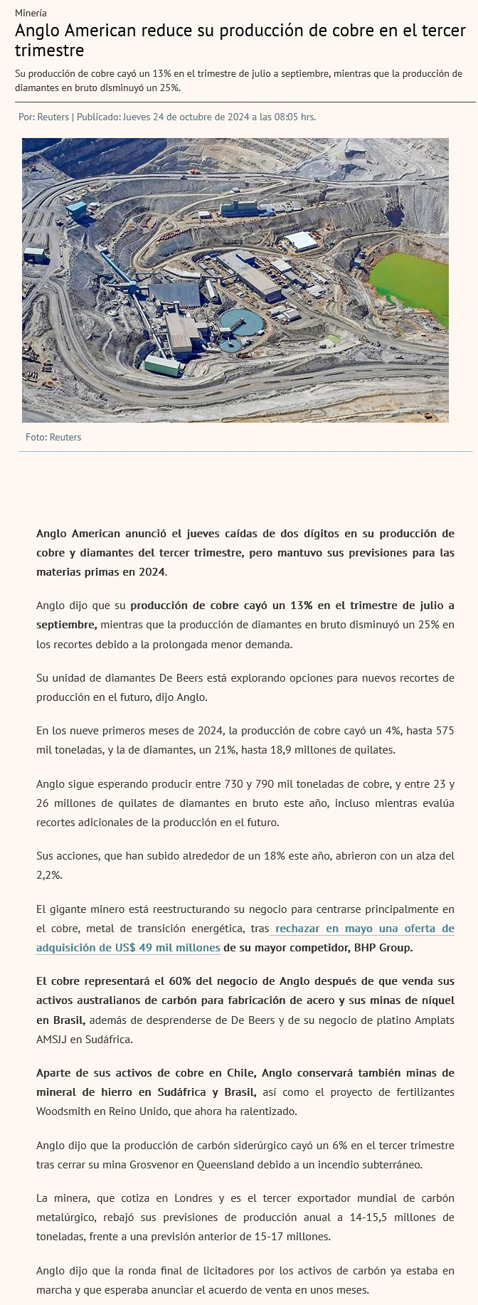 Pese a caída en producción de cobre, Anglo American mantiene proyección para 2024 - (La Tercera Online)