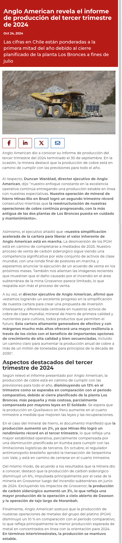 Los Bronces de Anglo American anota caída de 20% en su producción de cobre - (Diario Financiero)