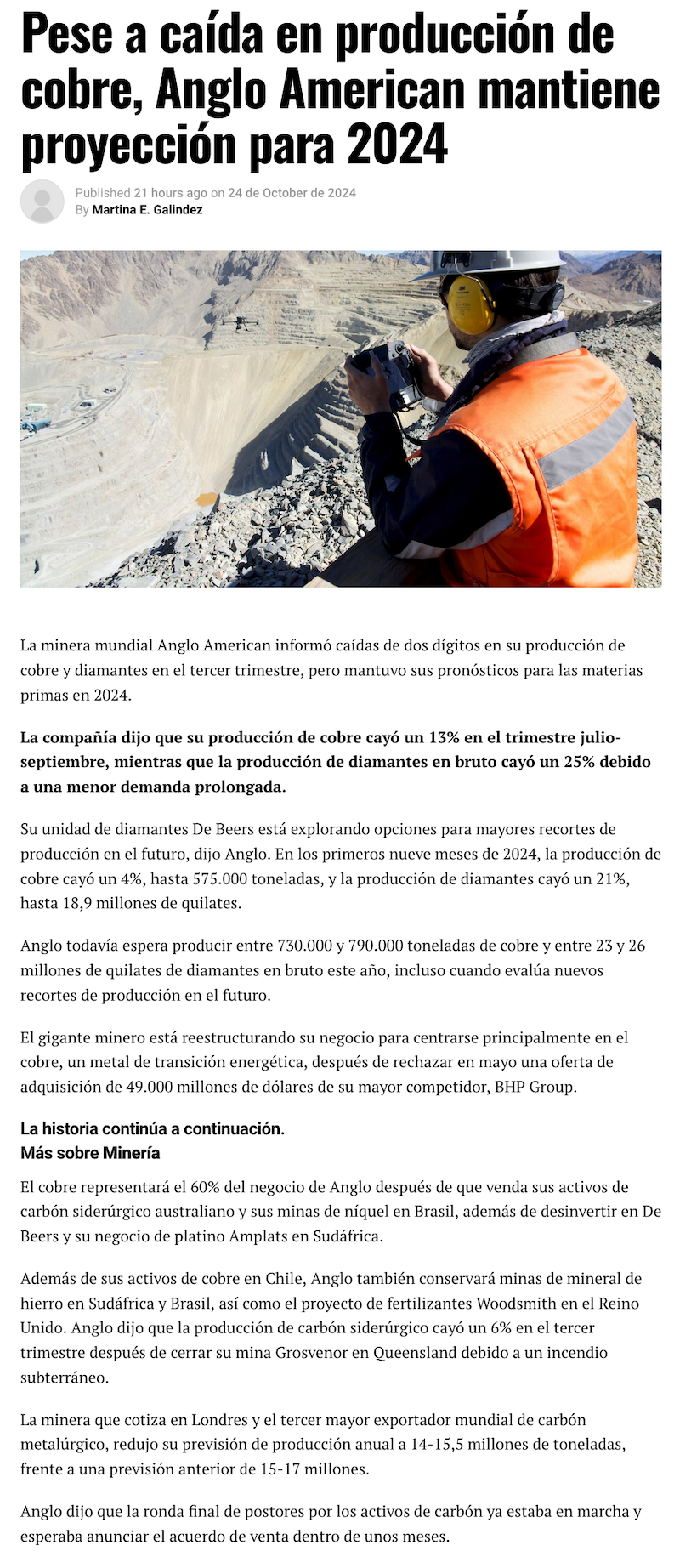 Pese a caída en producción de cobre, Anglo American mantiene proyección para 2024 - (La Tercera Online)