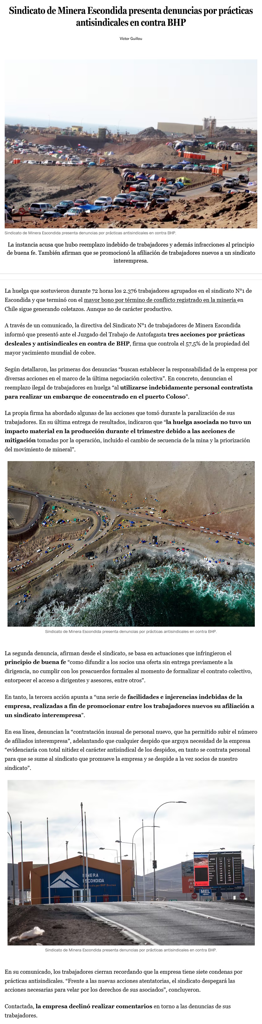 Sindicato de Minera Escondida de BHP presenta tres denuncias contra la empresa por "prácticas desleales y antisindicales" - (DF Online)