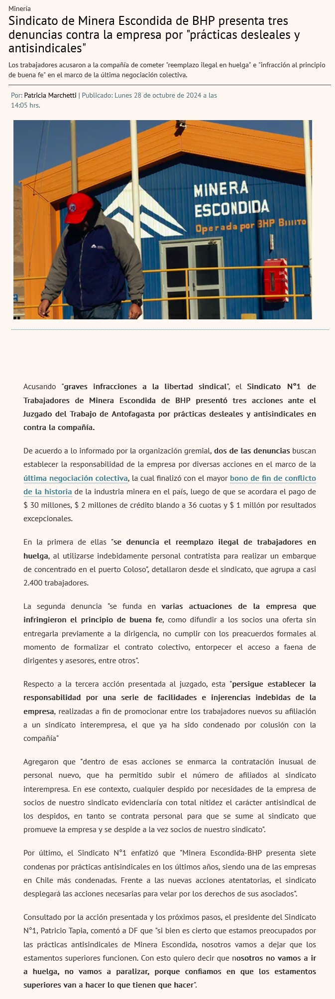 Sindicato de Minera Escondida presenta denuncias por prácticas antisindicales en contra BHP - (La Tercera Online)