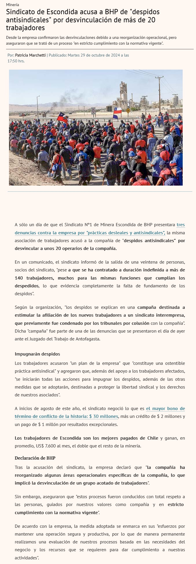 Sindicato de Minera Escondida de BHP presenta tres denuncias contra la empresa por "prácticas desleales y antisindicales" - (ciedess.cl)