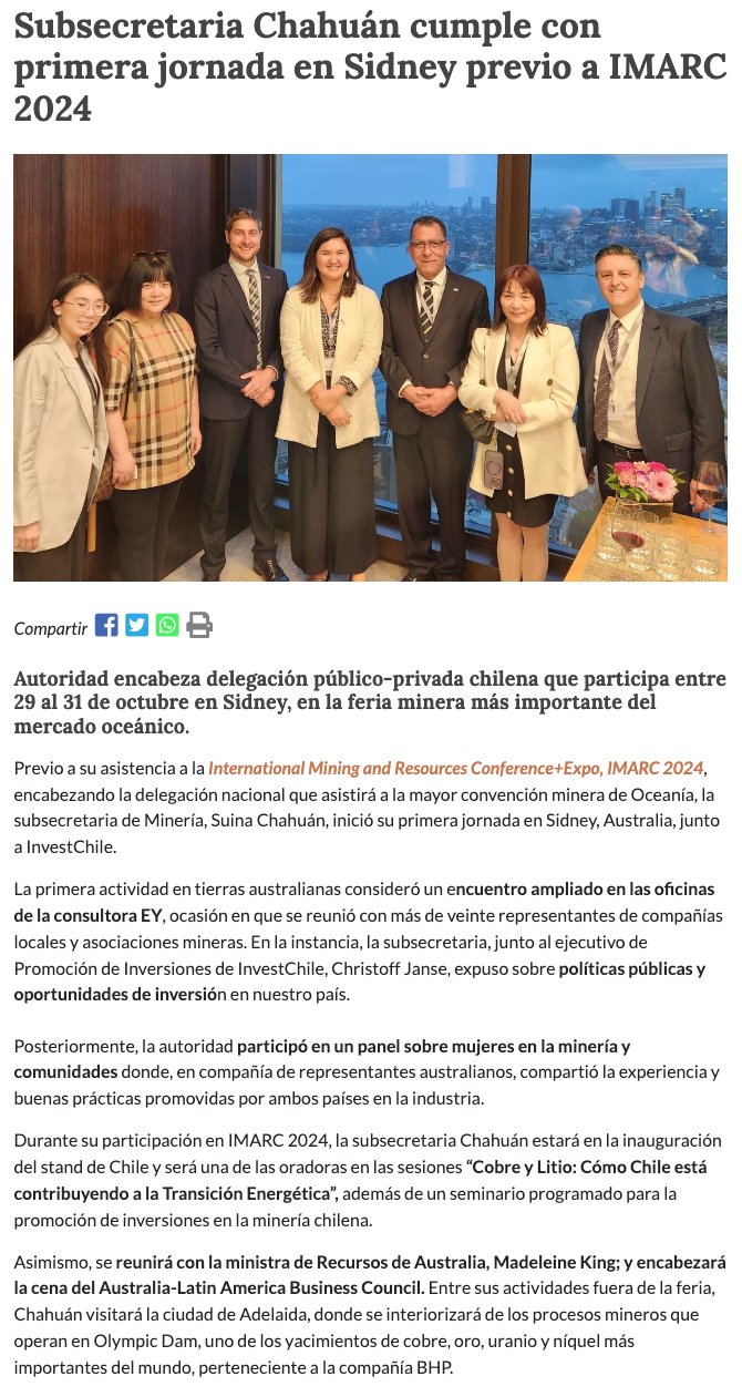 Subsecretaria Chahuán cumple en Australia nutrida agenda previa a participación en Imarc 2024 - (nuevaminería online)