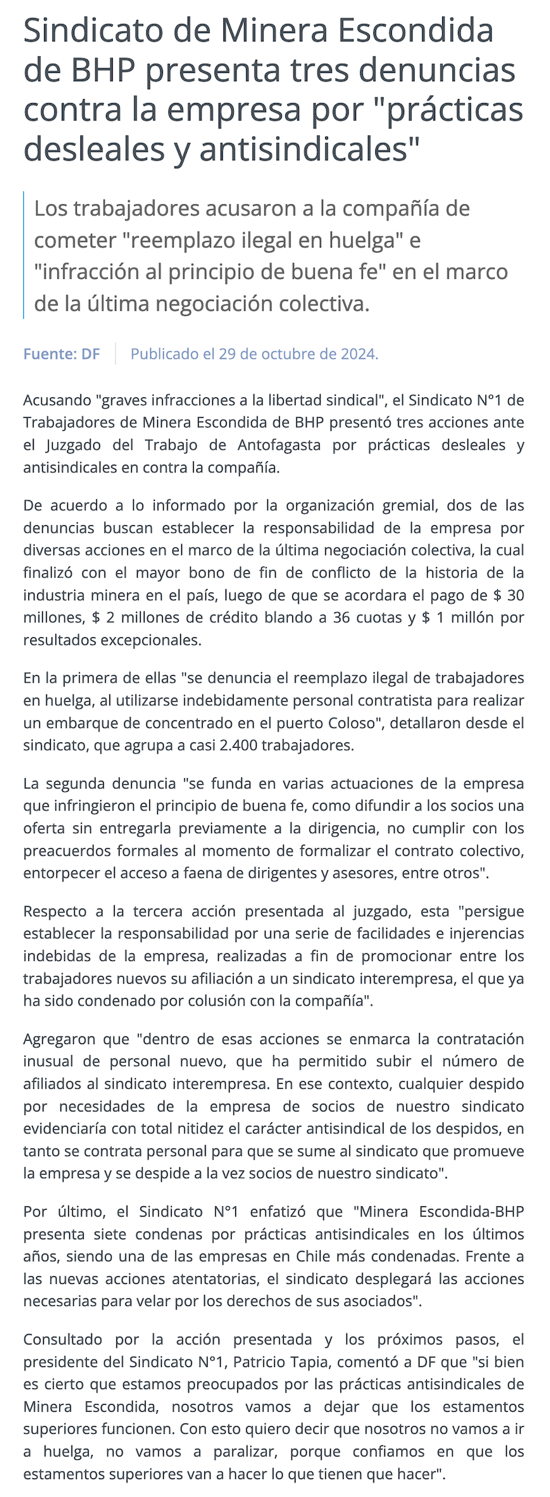 Sindicato de Escondida acusa a BHP de "despidos antisindicales" por desvinculación de más de 20 trabajadores - (DF Online)