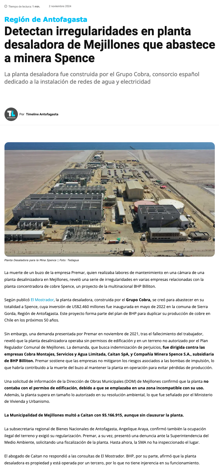 Mejillones: Planta que entrega agua de mar a Minera Spence no posee permisos - (antofagasta.tv)