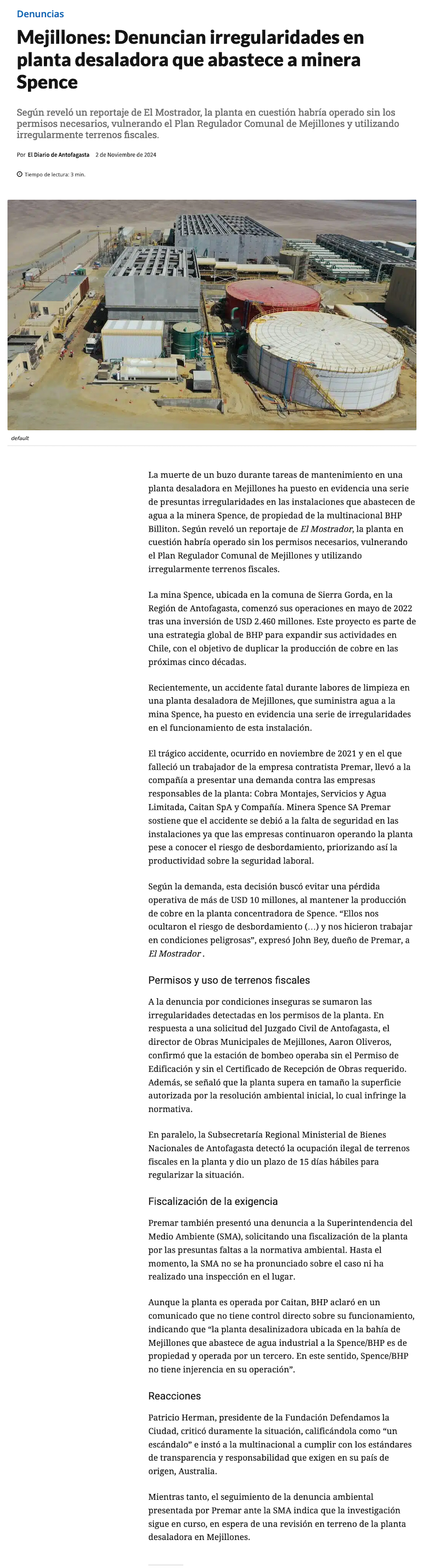 Detectan irregularidades en planta desaladora de Mejillones que abastece a minera Spence - (timeline)