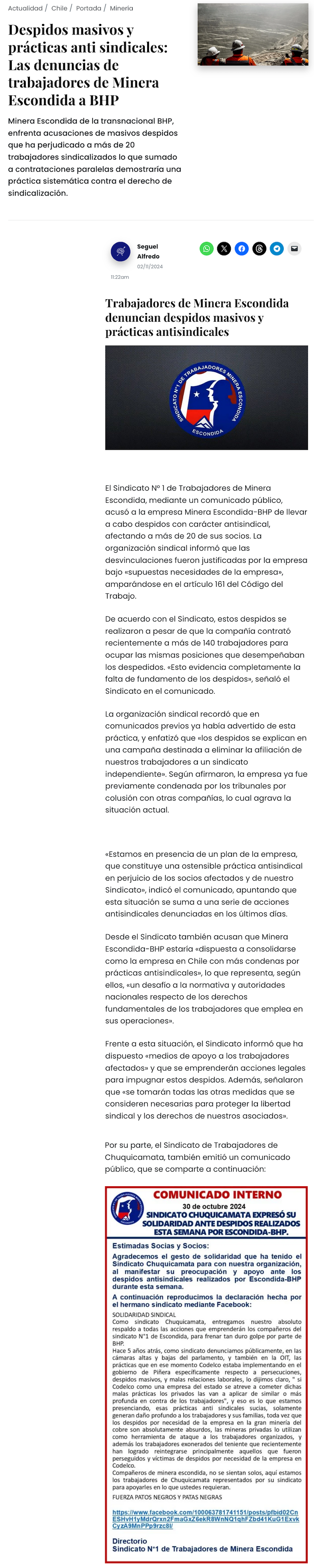 Sindicato de Minera Escondida denuncia despidos masivos y acusa prácticas antisindicales por parte de BHP - (elregionalista)
