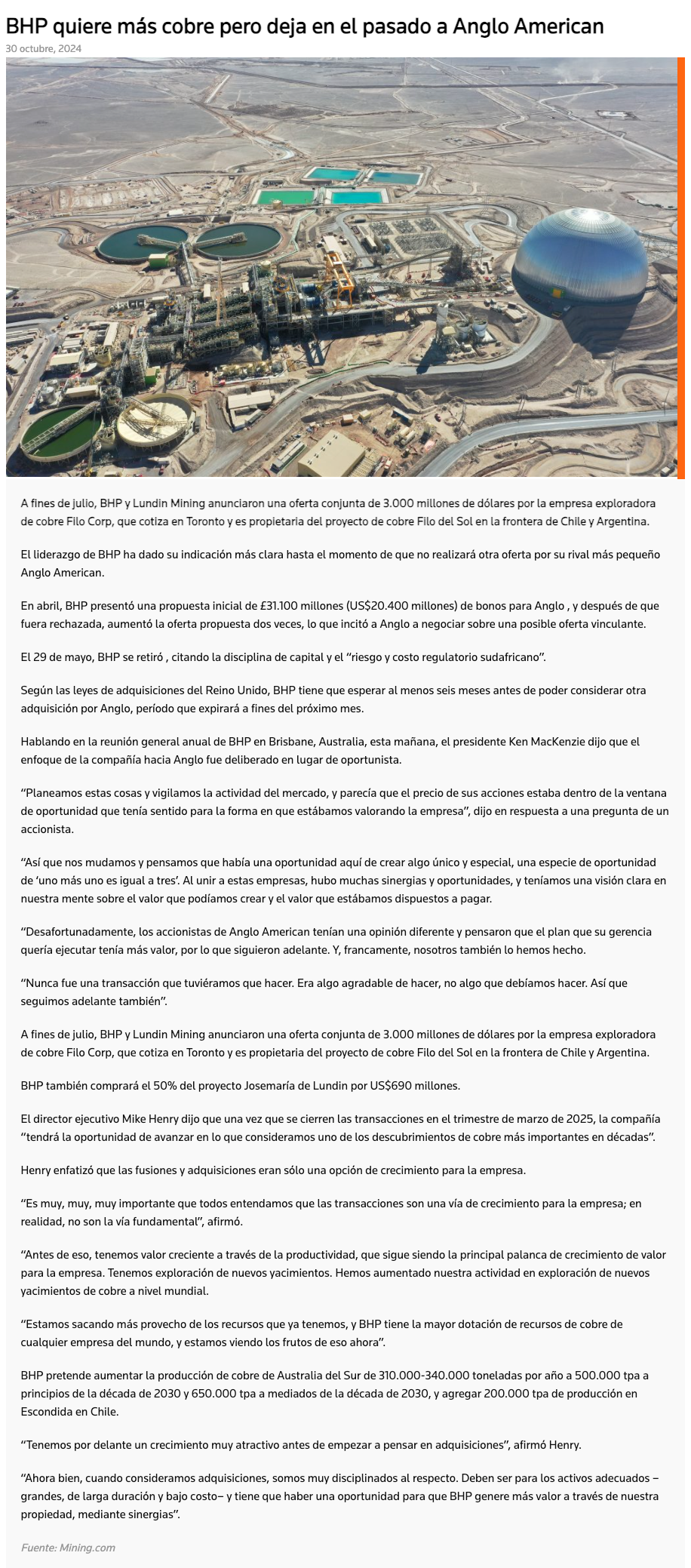 BHP descarta intento de adquisición de Anglo American y refuerza sus estrategias de crecimiento - (minerialocal.cl)