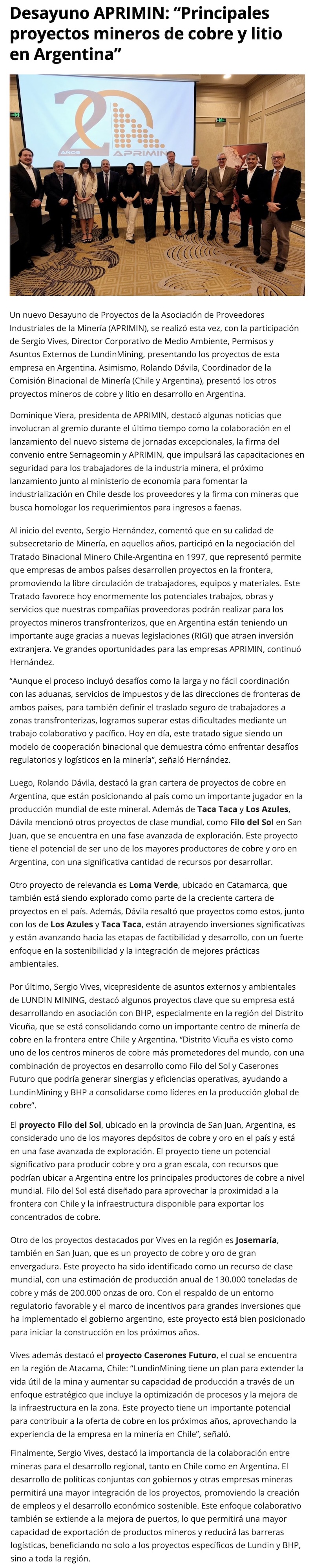 Desayuno Aprimin: “Principales proyectos mineros de cobre y litio en Argentina” - (nuevaminería online)