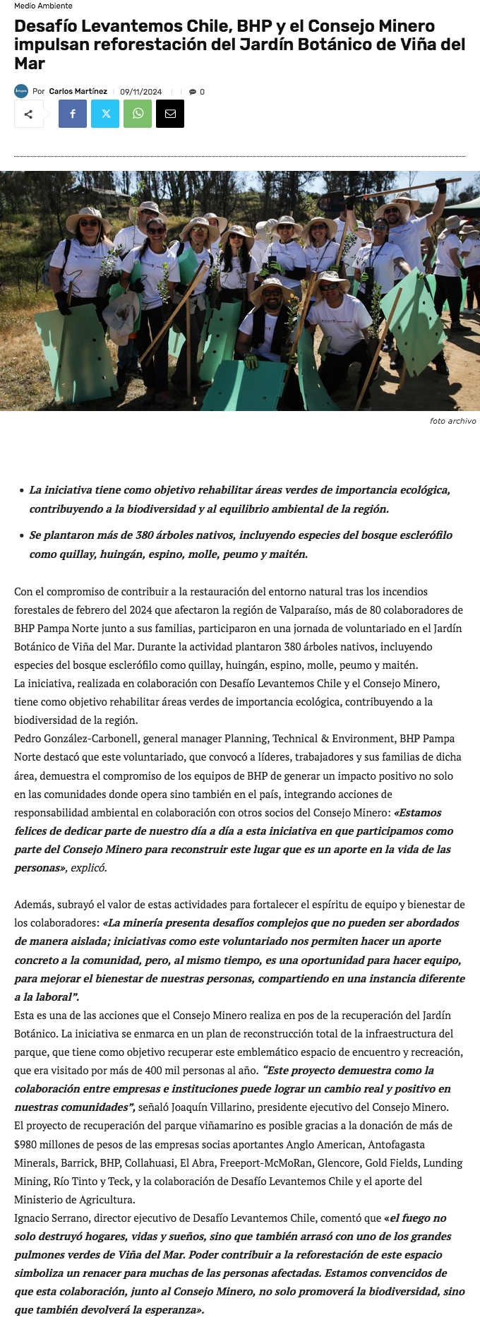 Desafío Levantemos Chile, BHP y el Consejo Minero impulsan reforestación del Jardín Botánico de Viña del Mar - (infogate.cl)