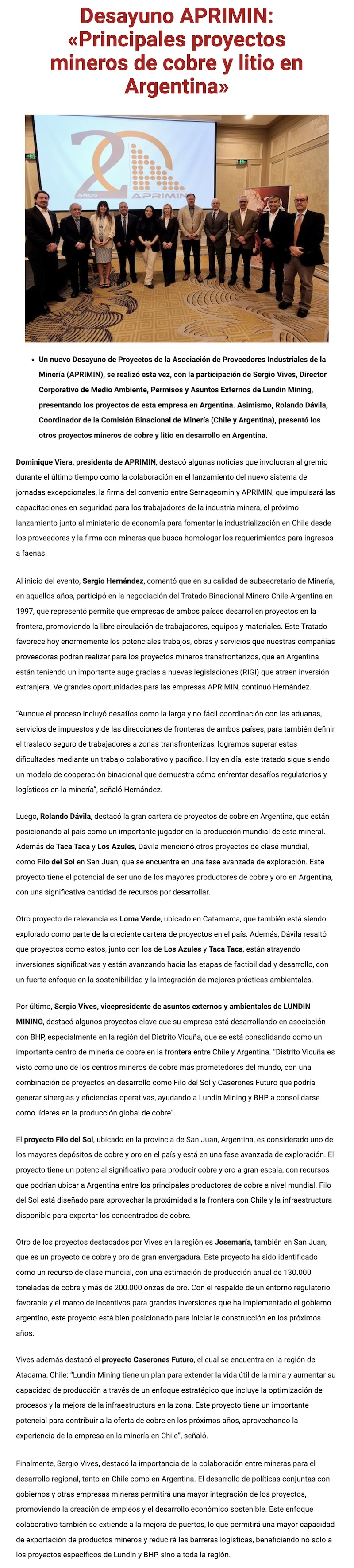 Desayuno APRIMIN: “Principales proyectos mineros de cobre y litio en Argentina” - (mvcomunicaciones.cl)