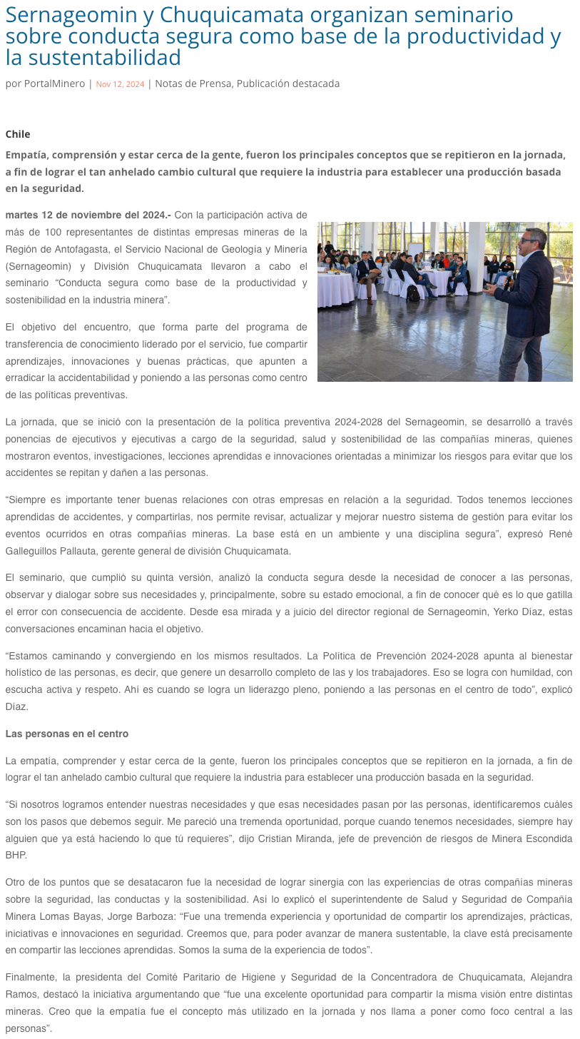 Sernageomin y Chuquicamata organizan seminario sobre conducta segura como base de la productividad y la sustentabilidad - (nuevaminería online)