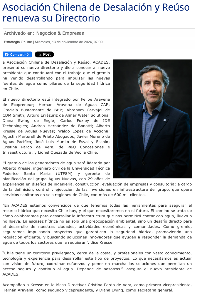 Asociación Chilena de Desalación y Reúso renueva su directorio - (nuevaminería online)
