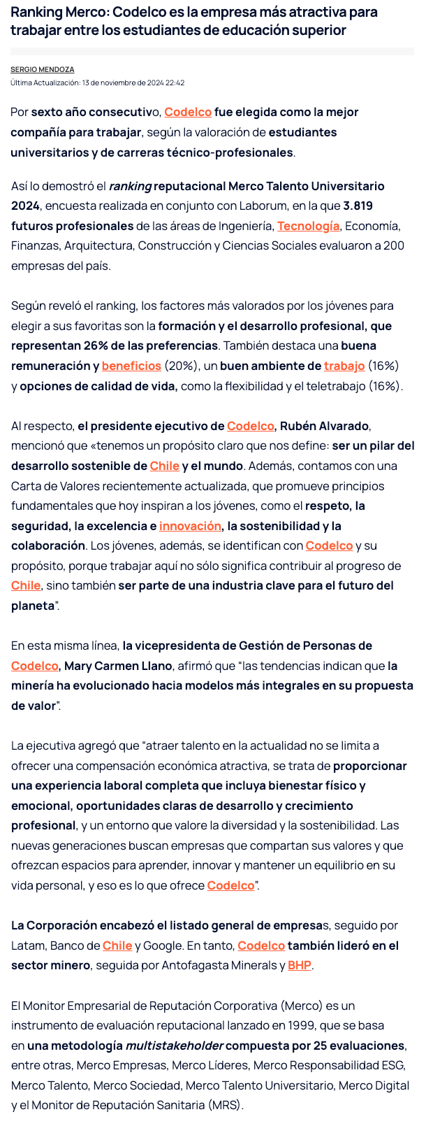 Merco Talento Universitario 2024: Codelco, la empresa preferida por los jóvenes - (redimin)