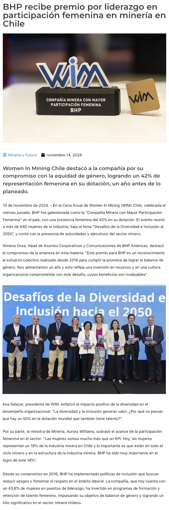 WIM premia a BHP como la compañía minera con mayor participación femenina en Chile - (mvcomunicaciones.cl)