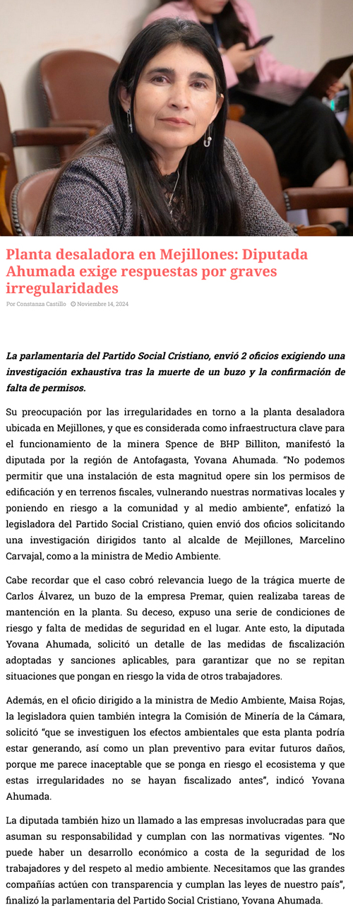 Planta desaladora en Mejillones: Diputada Ahumada exige respuestas por graves irregularidades - (desiertofm.cl)