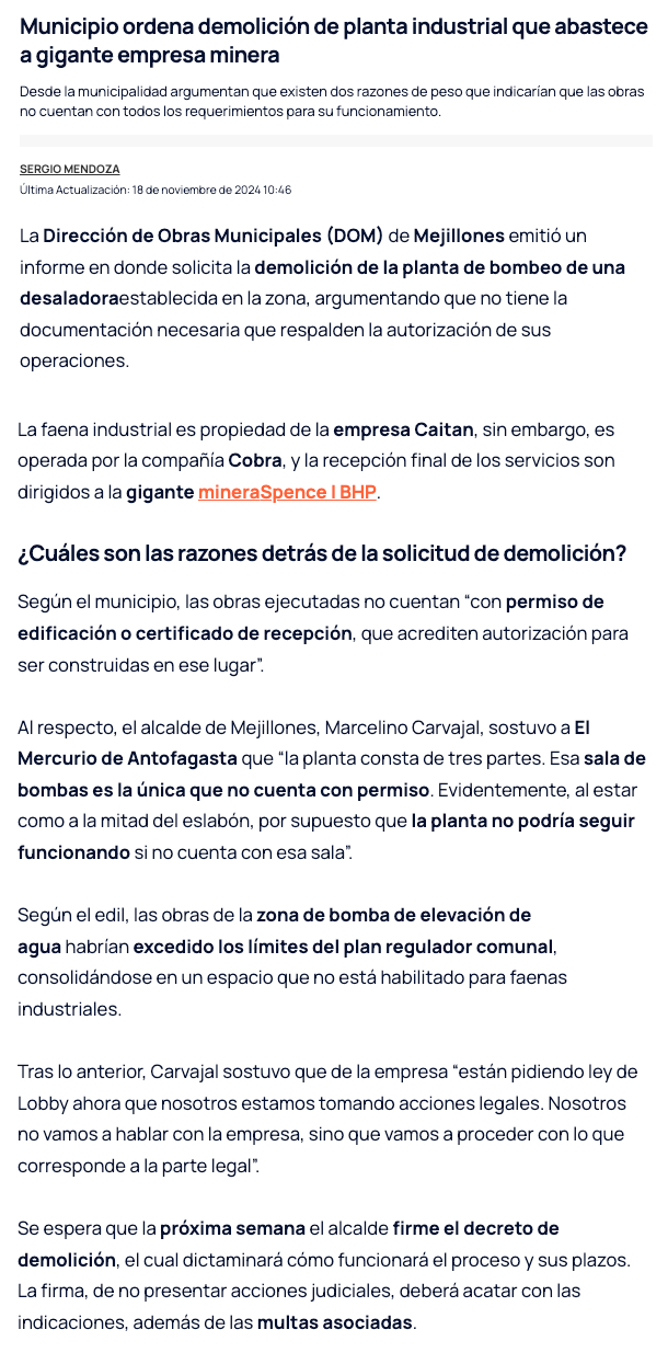 Municipio de Mejillones ordena demolición de instalaciones de planta desaladora irregular que abastece a minera Spence - (elregionalista)