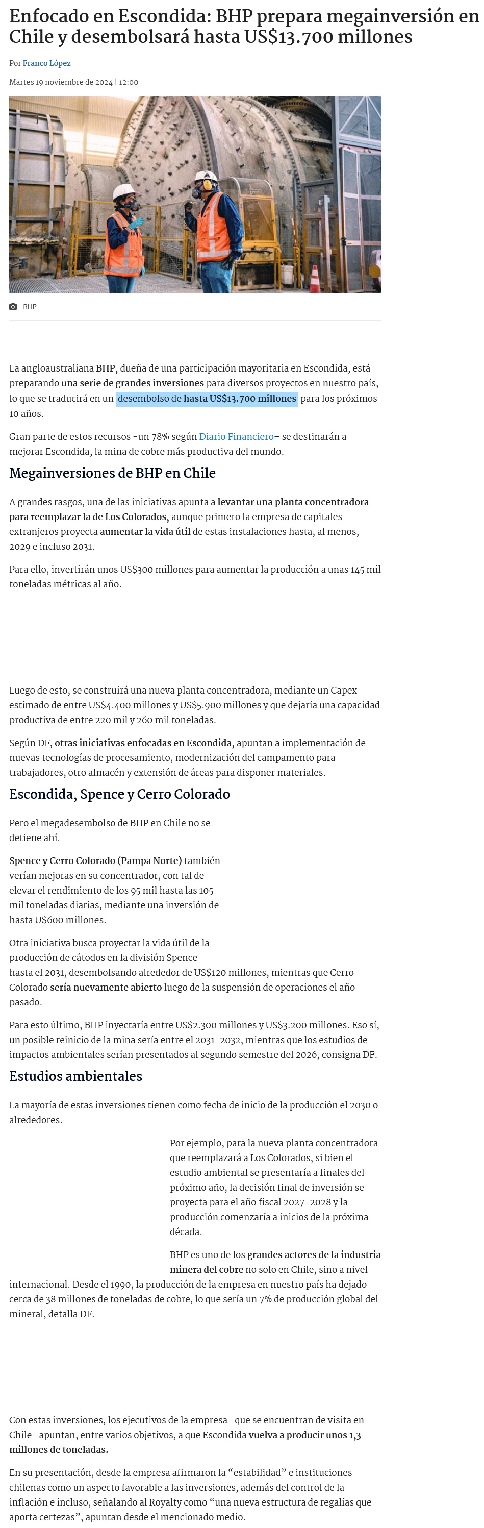 BHP: megainversión de hasta US$13.700 millones para elevar producción en yacimientos con foco en Escondida - (soyantofagasta)