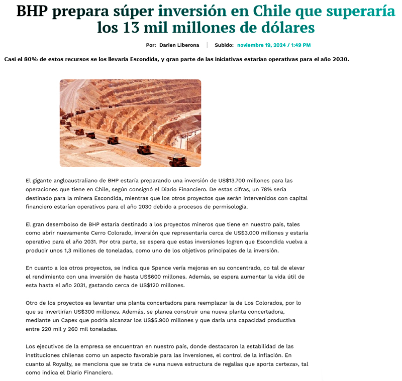 Minera BHP prepara inversiones por hasta US$ 13.700 millones en Chile - (americaeconomia online)