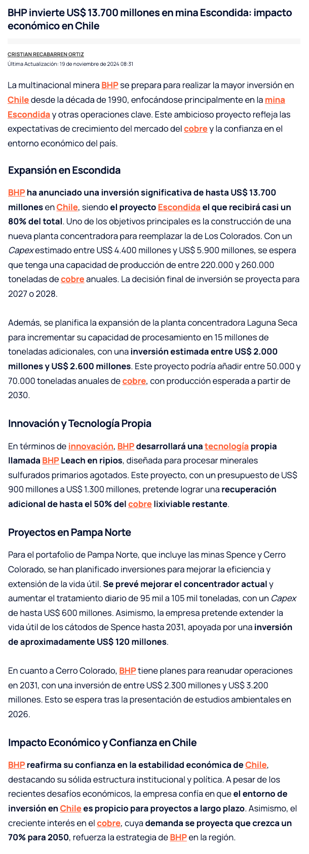 BHP: megainversión de hasta US$13.700 millones para elevar producción en yacimientos con foco en Escondida - (soyantofagasta)