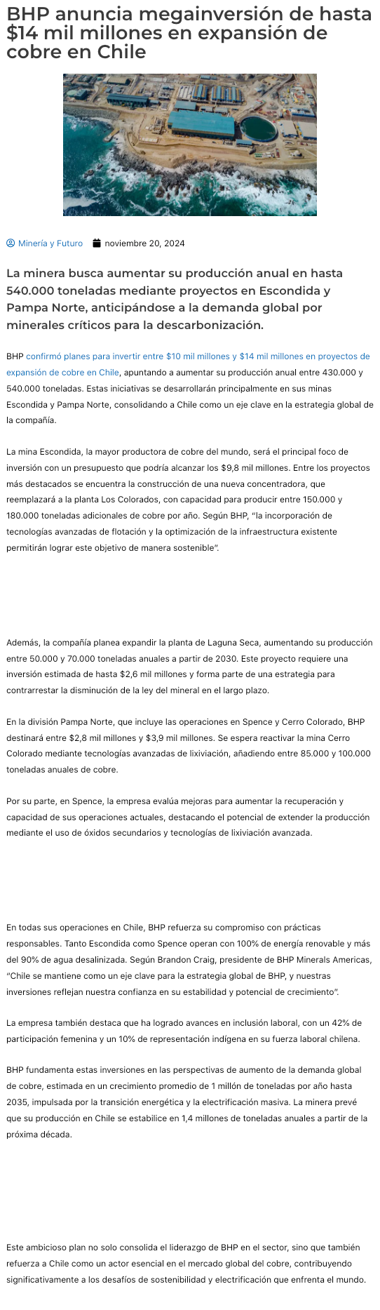 BHP anuncia inversión millonaria en Chile para incrementar producción de cobre hasta 2032 - (elperiodista.cl)