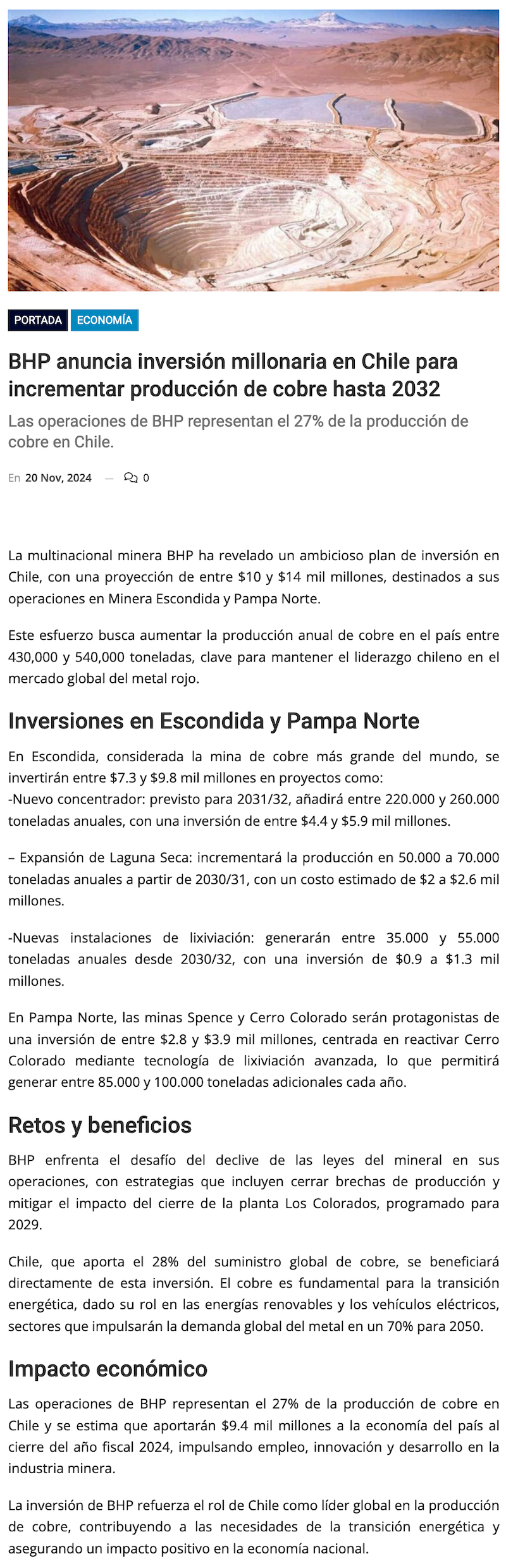 BHP anuncia megainversión de hasta $14 mil millones en expansión de cobre en Chile - (mineriayfuturo.cl)
