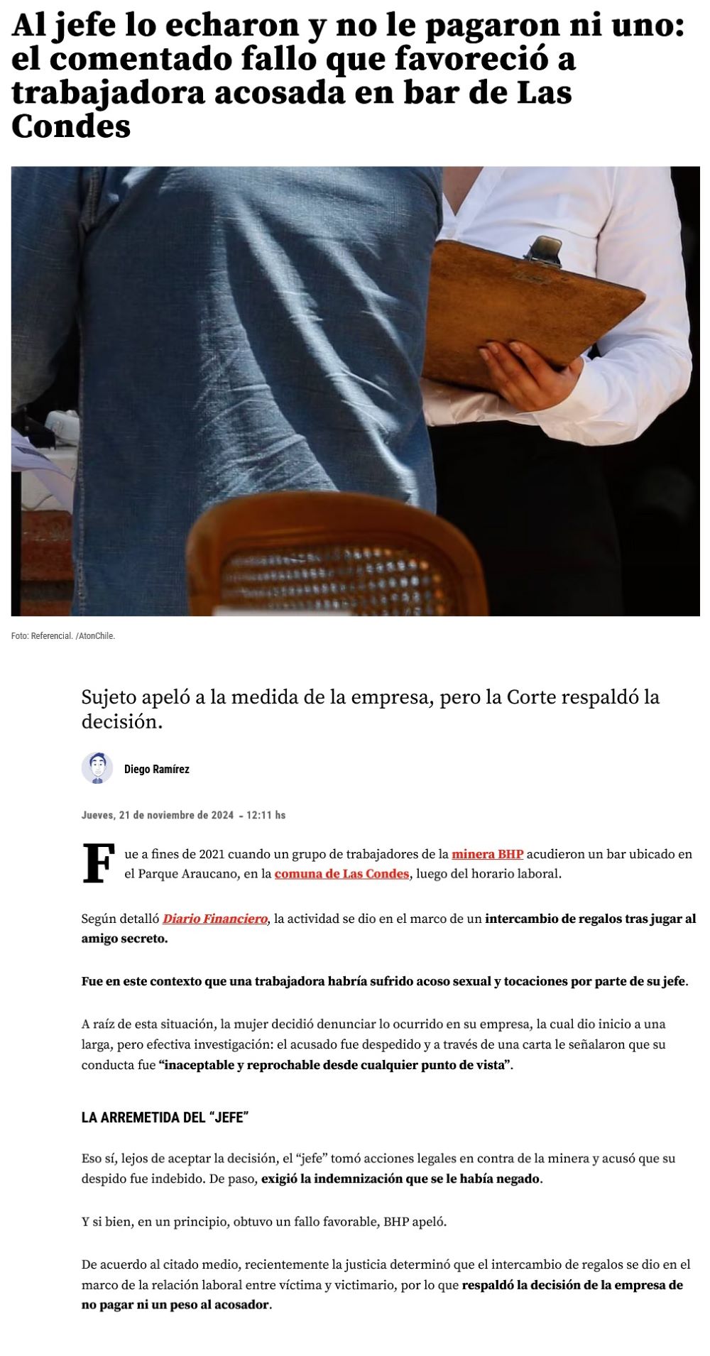 Despido en BHP tras "after office" abre debate por ley Karin: ¿Qué pasa si hay acoso fuera del trabajo? - (emol)