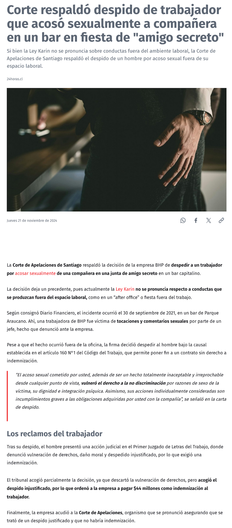 Despido en BHP tras "after office" abre debate por ley Karin: ¿Qué pasa si hay acoso fuera del trabajo? - (emol)