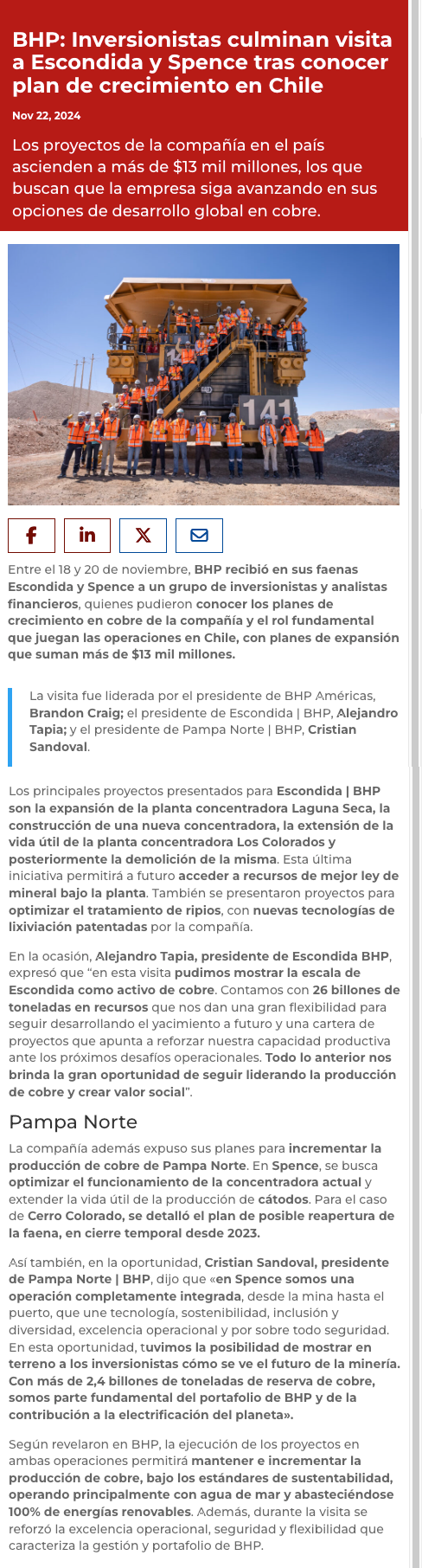 Inversionistas culminan visita a Escondida y Spence tras conocer plan de crecimiento de BHP en Chile - (portalminero)