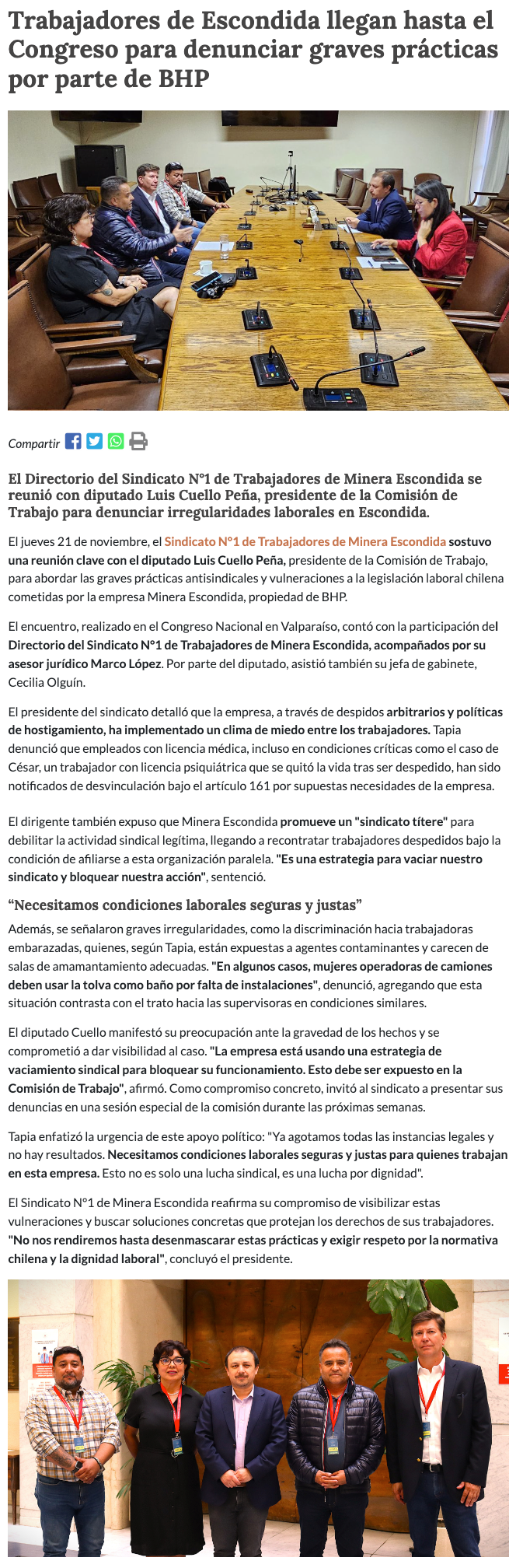 Trabajadores de Escondida llegan hasta el Congreso para denunciar graves prácticas por parte de BHP - (reporteminero)