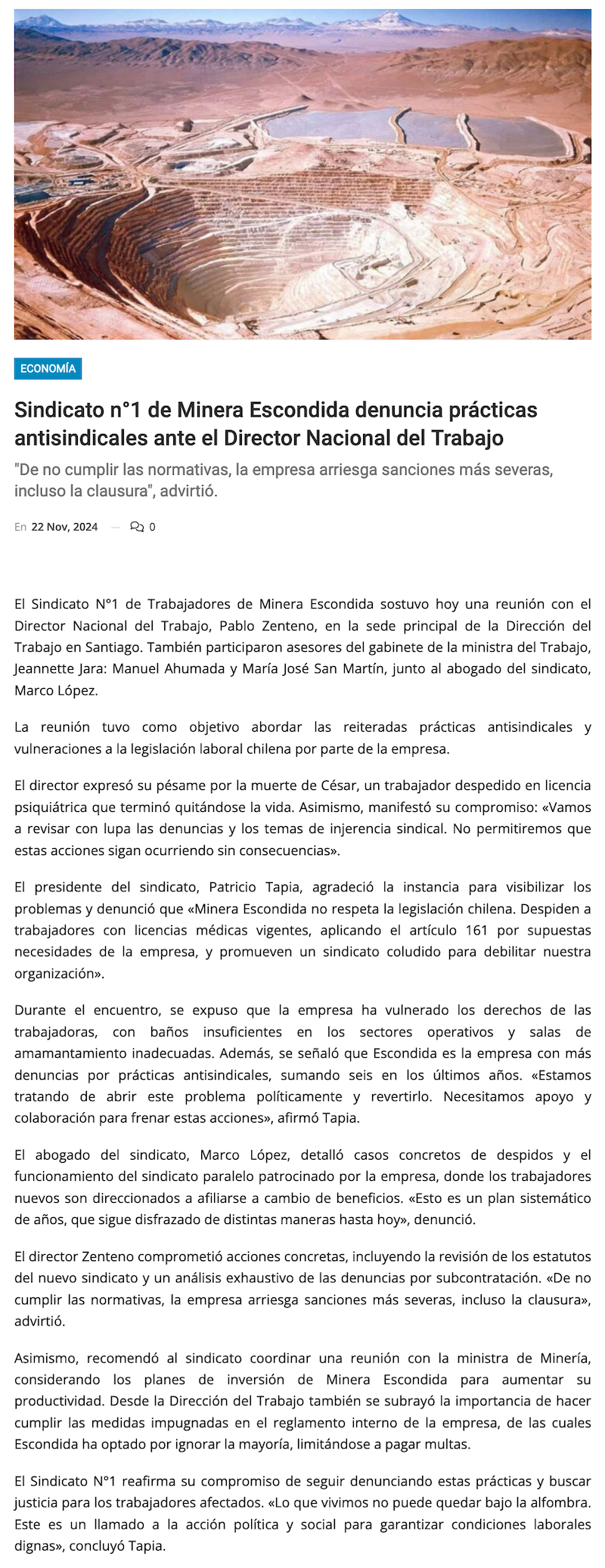 Sindicato Nº1 de Minera Escondida denuncia prácticas antisindicales ante el Director Nacional del Trabajo - (piensaprensa.com)