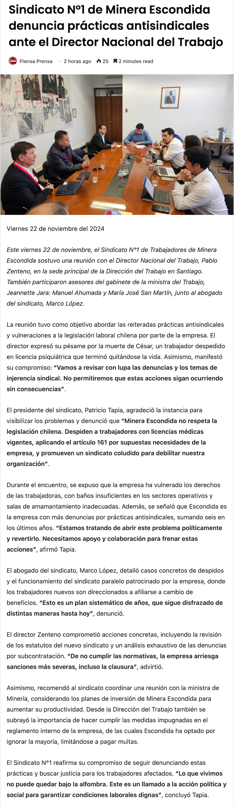 Sindicato n°1 de Minera Escondida denuncia prácticas antisindicales ante el Director Nacional del Trabajo - (elperiodista.cl)