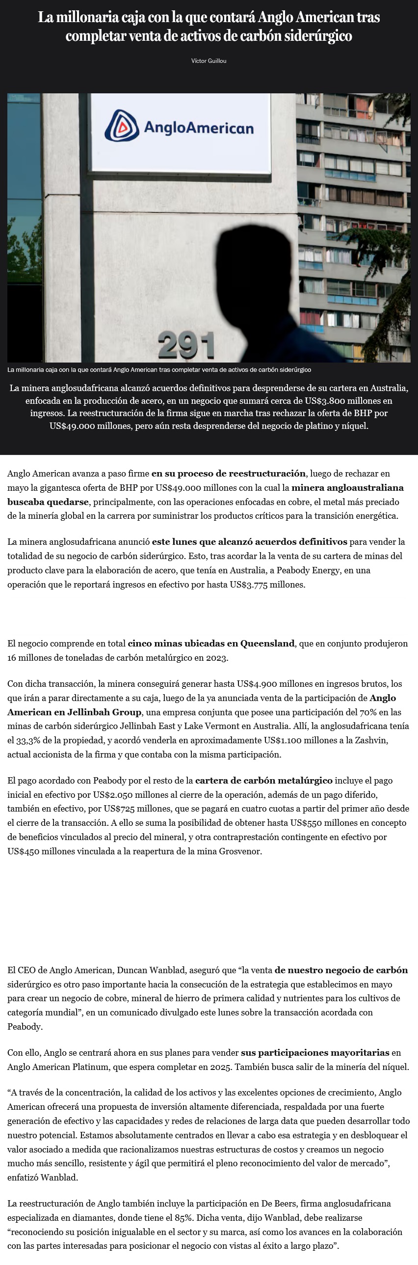 La millonaria caja con la que contará Anglo American tras completar venta de activos de carbón siderúrgico - (Pulso)