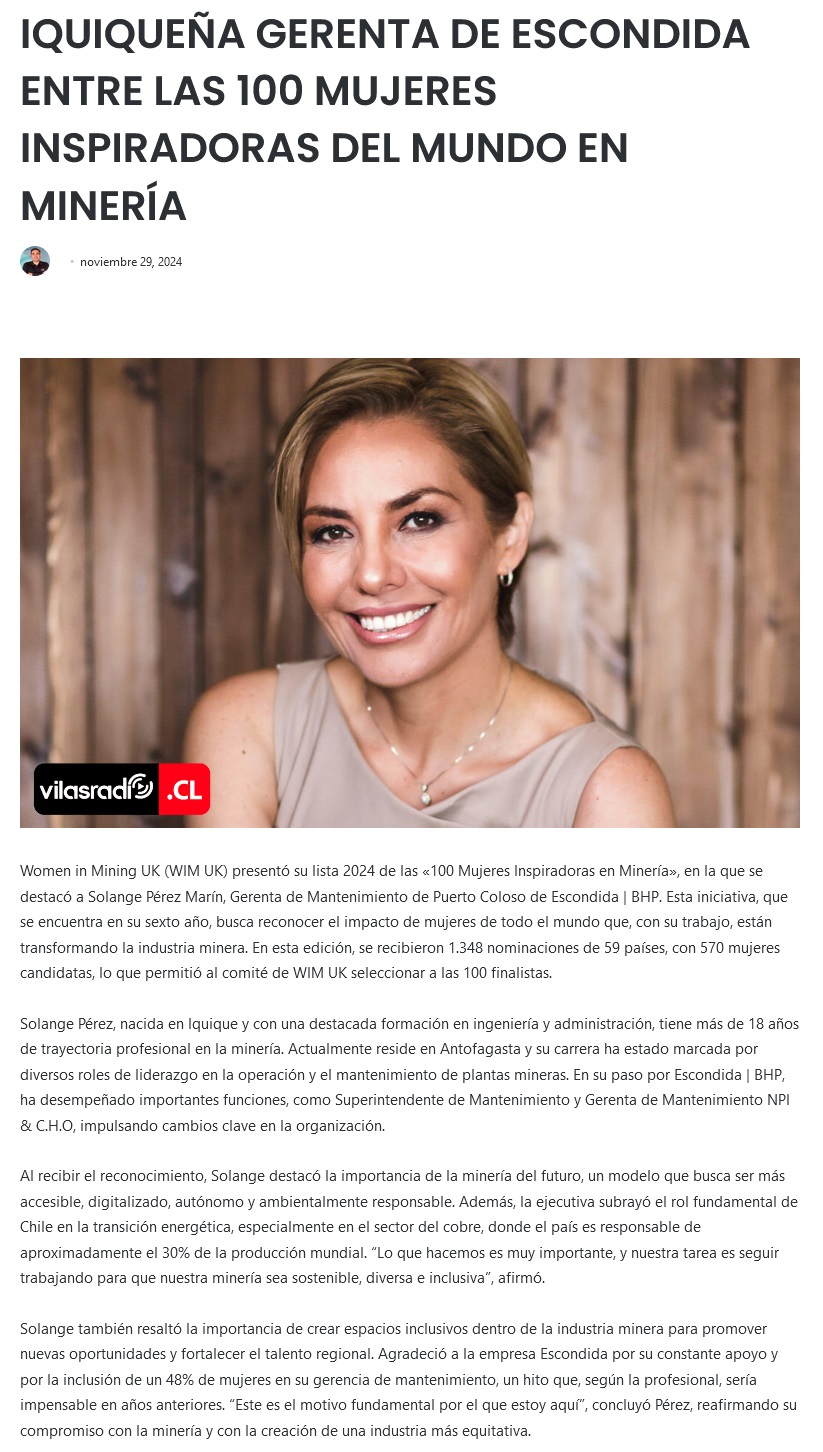 Ingeniera Solange Pérez entre las 100 mujeres inspiradoras mundiales en minería - (Revista Norte Minero)