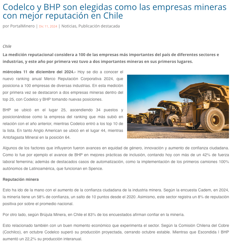 Ranking Merco 2024: Codelco y BHP son elegidas como las empresas mineras con mejor reputación en Chil - (nuevaminería online)