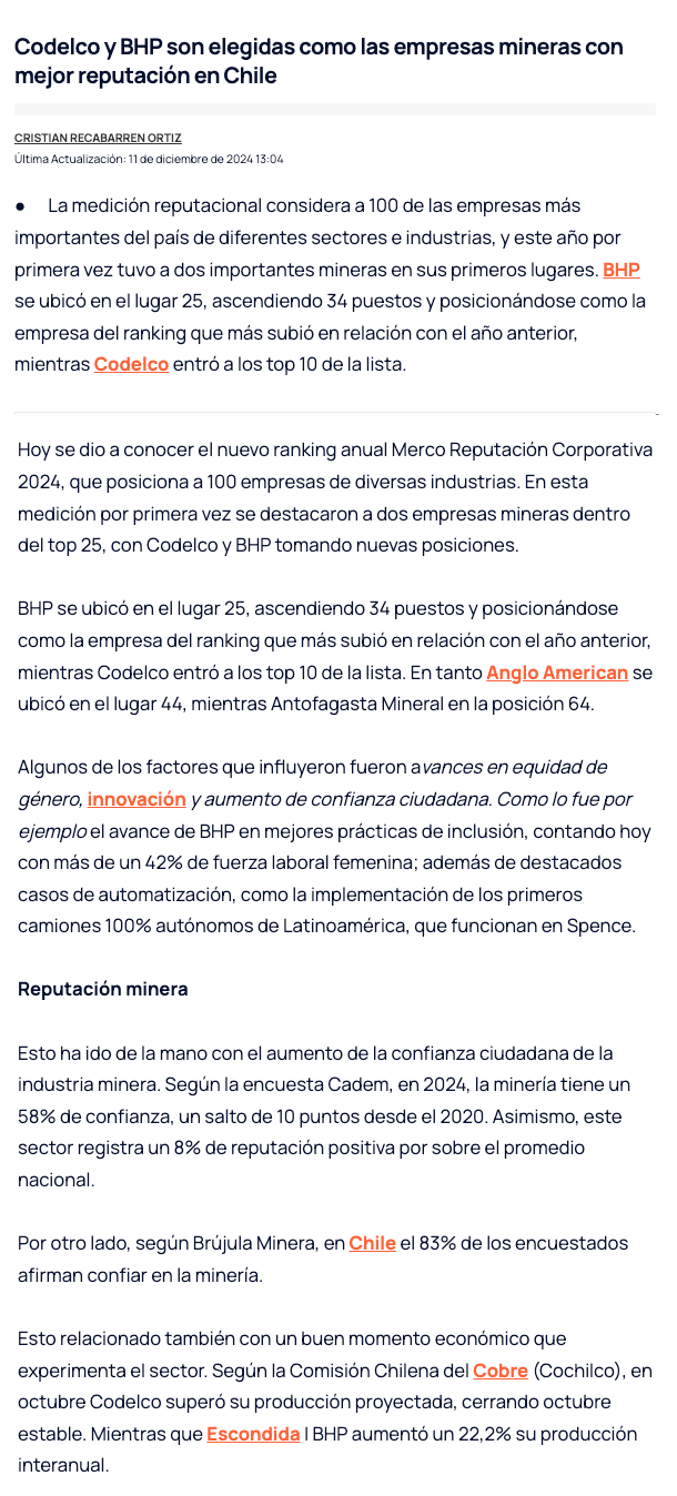Ranking Merco 2024: Codelco y BHP son elegidas como las empresas mineras con mejor reputación en Chil - (nuevaminería online)