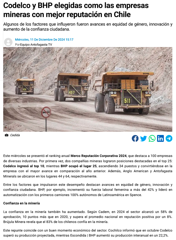 Ranking Merco 2024: Codelco y BHP son elegidas como las empresas mineras con mejor reputación en Chil - (nuevaminería online)