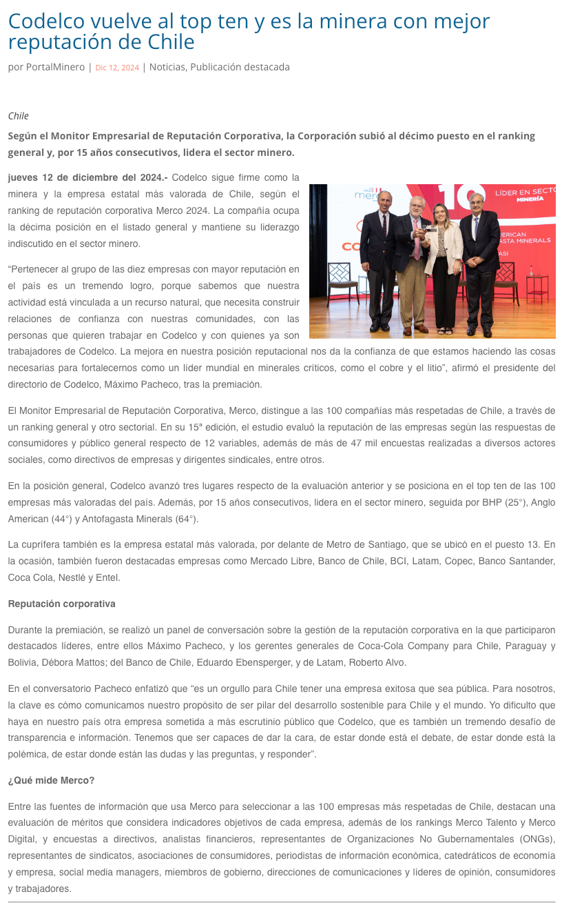 Codelco vuelve al top ten y es la minera con mejor reputación de Chile - (mch.cl)