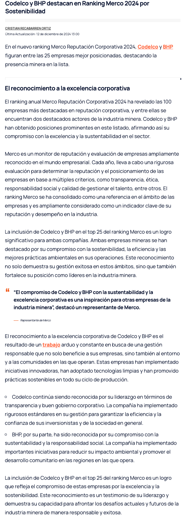 Codelco vuelve al top ten y es la minera con mejor reputación de Chile - (mch.cl)