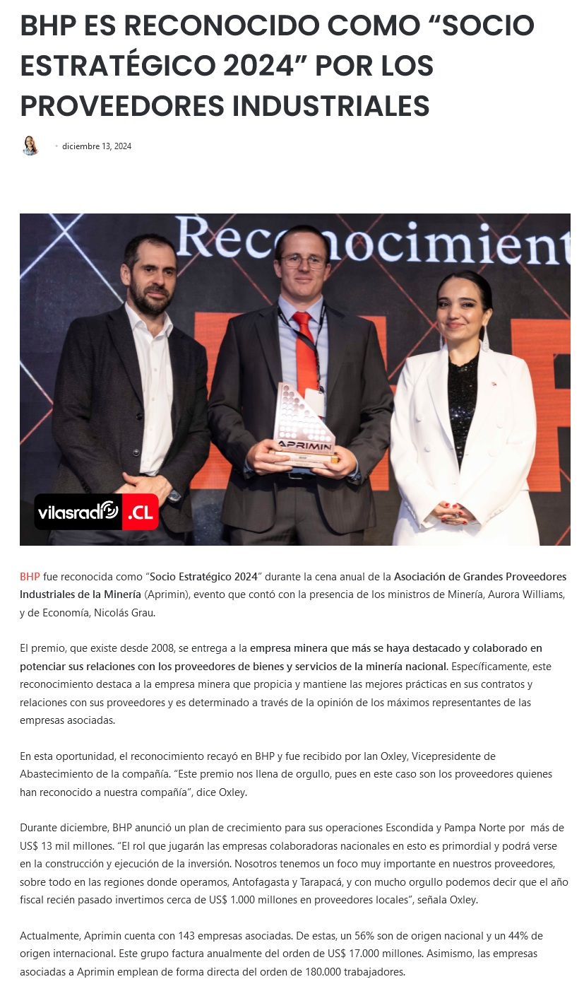 BHP es reconocido como “Socio Estratégico 2024” por los proveedores industriales - (Radio San Andrés (Pica))