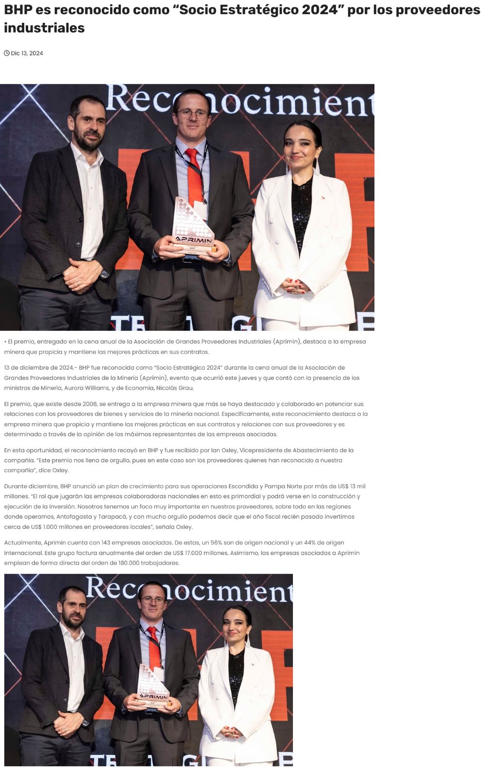 BHP es reconocido como "Socio Estratégico 2024" por los proveedores industriales - (vilasradio.cl)