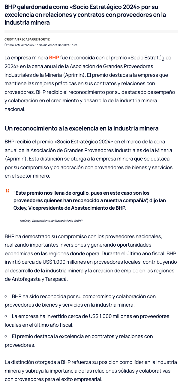 BHP es reconocido como “Socio Estratégico 2024” por los proveedores industriales - (elperiodista.cl)
