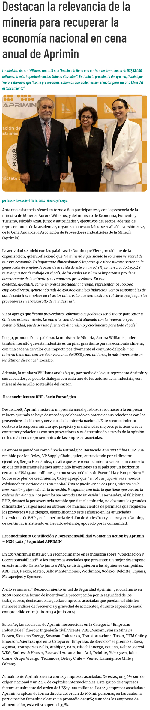 Cena Anual Aprimin: destacan la relevancia de la minería para recuperar la economía nacional - (mvcomunicaciones.cl)