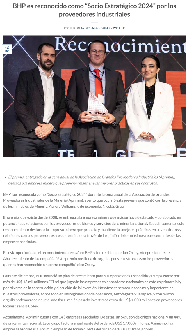 BHP es reconocida como “Socio Estratégico 2024” por los proveedores industriales - (timeline)