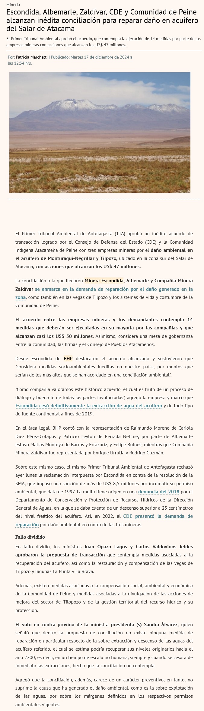 Por dañar acuífero en Salar de Atacama 3 grandes mineras demandadas invertirán $47 mil millones para restaurarlo - (eldesconcierto)