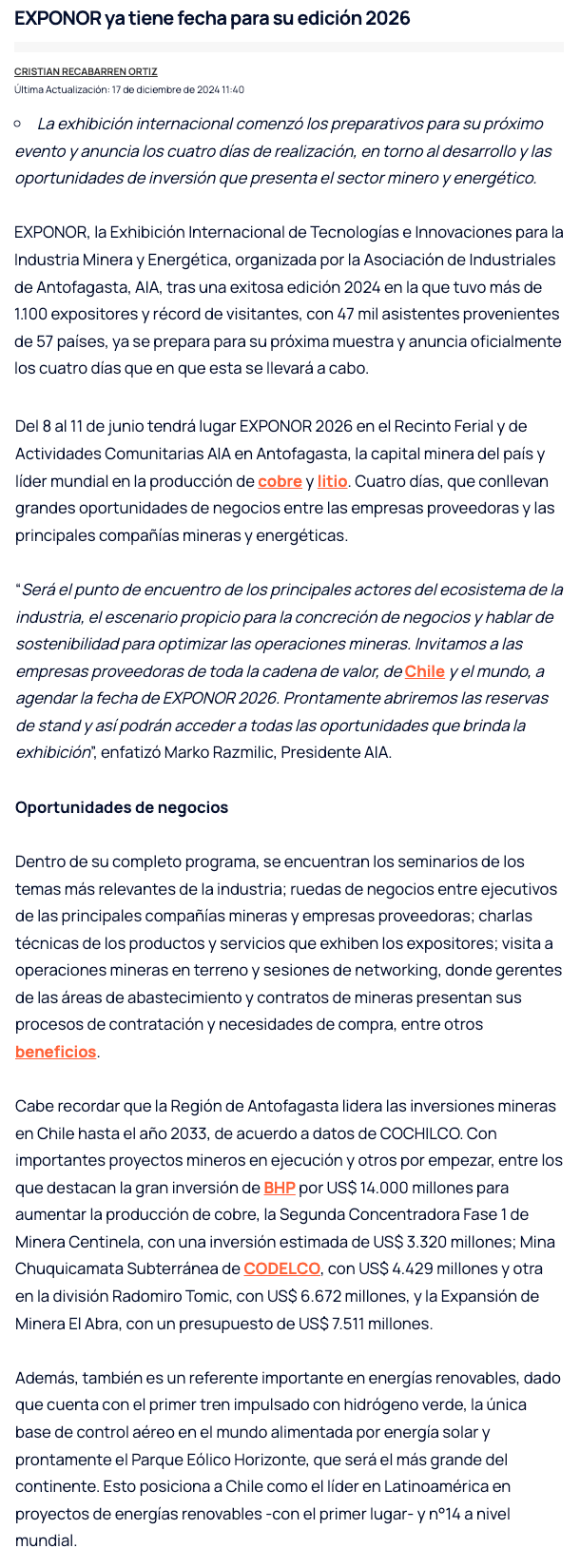 Ya tiene fecha próxima versión de Exponor: será del 8 al 11 de junio en 2026 - (soyantofagasta)
