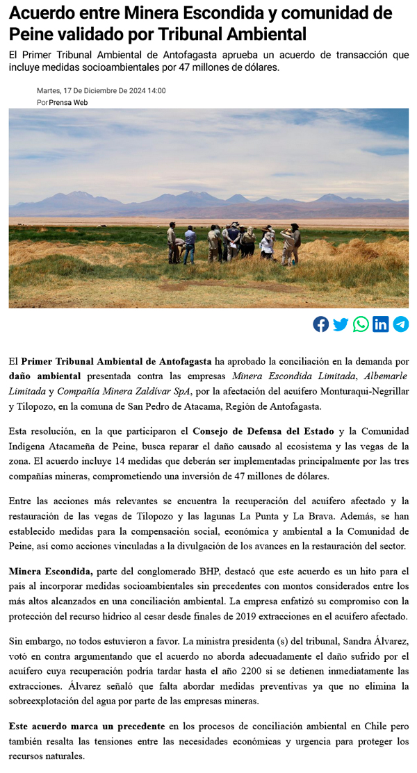 Escondida, Albemarle, Zaldivar, CDE y Comunidad de Peine alcanzan inédita conciliación para reparar daño en acuífero del Salar de Atacama - (DF Online)